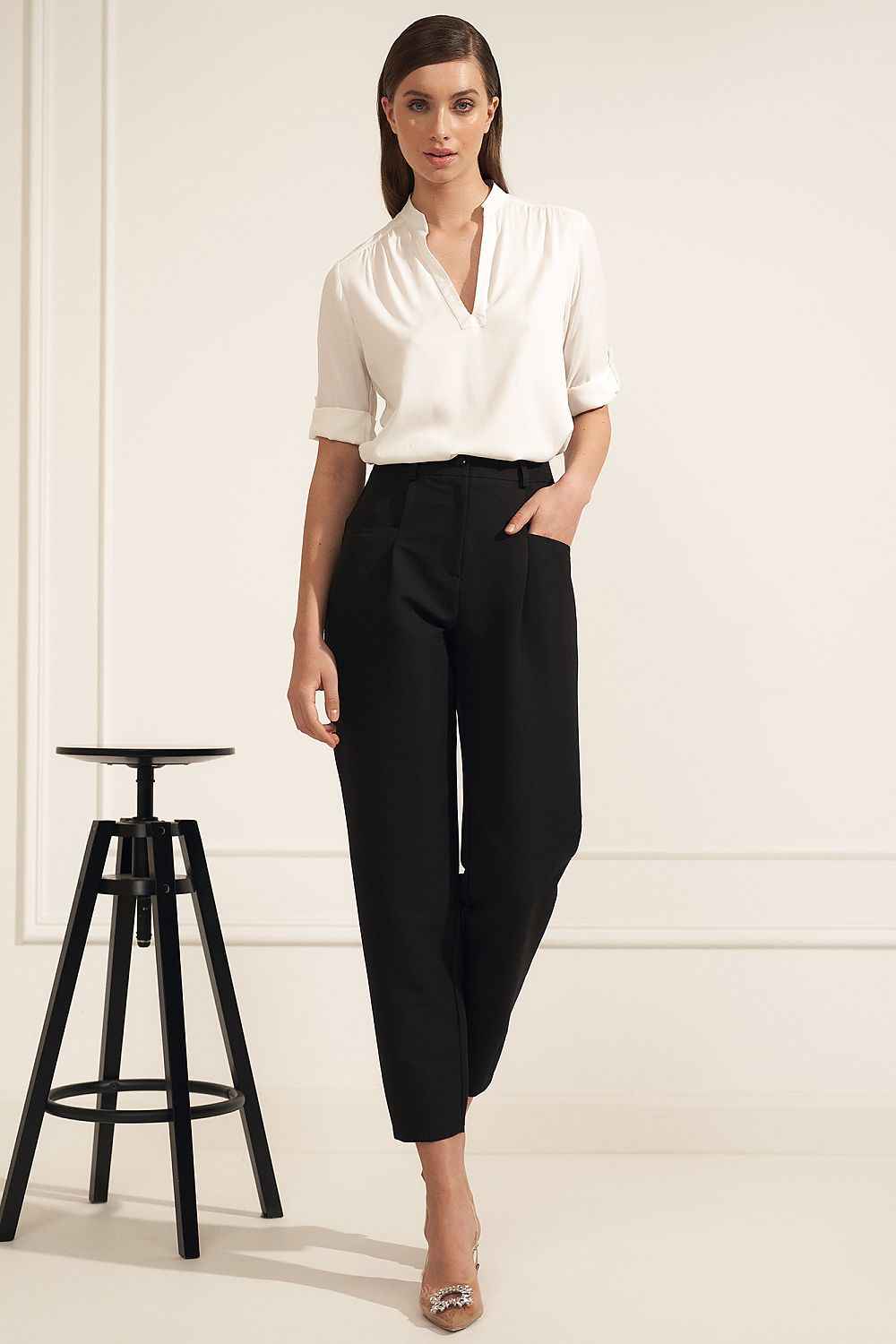 Made of high-quality viscose, the blouse will work perfectly in soft office stylizations. It goes well with black high-waisted cigarette pants and pencil skirts. The blouse has unusual ruching that gives the neckline a unique look, as well as rolled-up sleeves. The loose fit sits well on the silhouette.