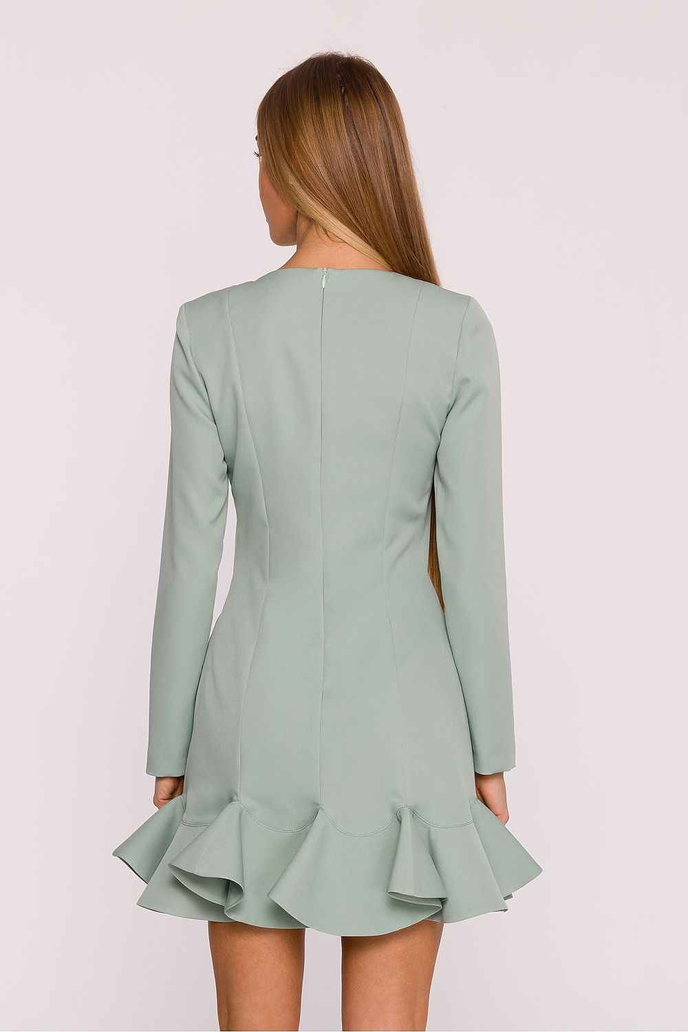 Subtle and feminine dress made of smooth fabric with a matte finish is a perfect choice for many occasions. The simple form has been enhanced with a fancy ruffle at the bottom, which gives the whole dress lightness and girlish charm. The model features a classic, semi-round neckline and long sleeves, making it look elegant and timeless. The hidden zipper at the back ensures easy dressing and a neat finish. The lack of pockets and lining makes the dress light, comfortable, and beautifully drapes on the silhouette. The design subtly emphasizes the figure - the top features a simple, slightly waisted line with shaping seams, while the flared bottom with a ruffle works beautifully in motion. The mini length adds freshness and a modern character to the outfit. Designed and made in Poland, with women in mind who appreciate simple elegance with a hint of originality.