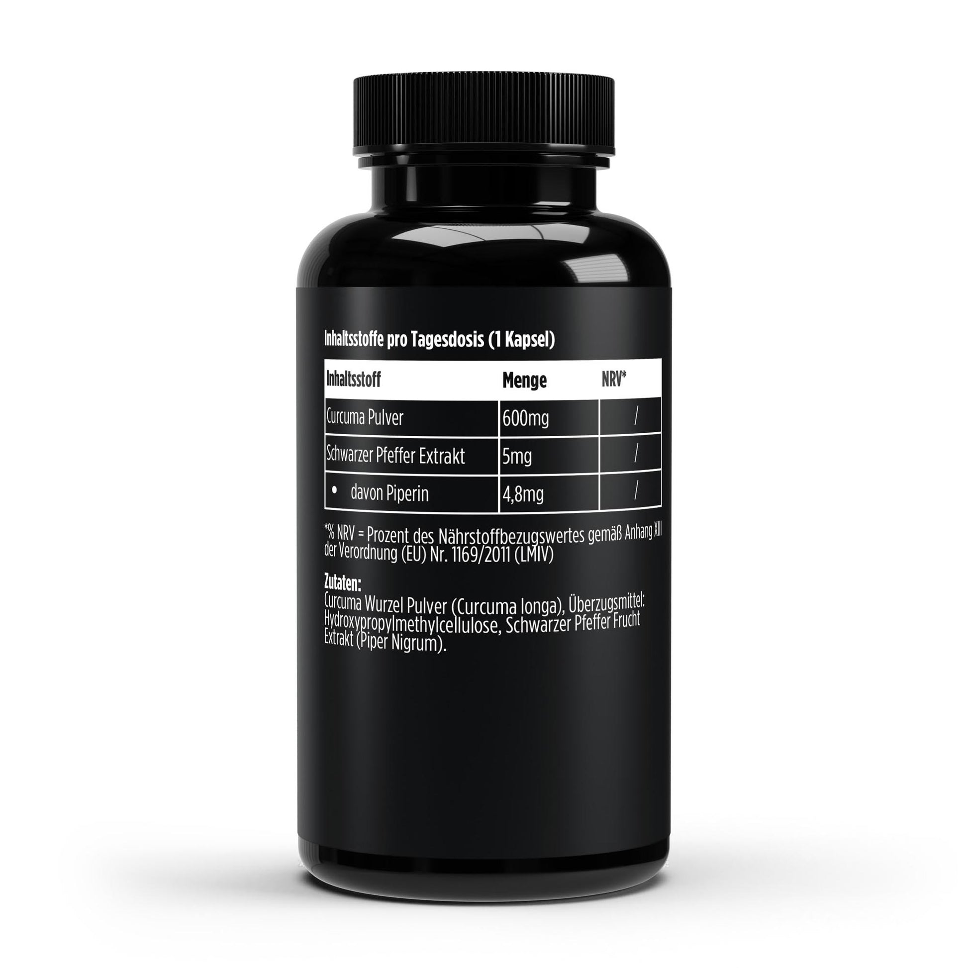 Suplemento alimentar com pó de curcuma e extrato de pimenta-preta.