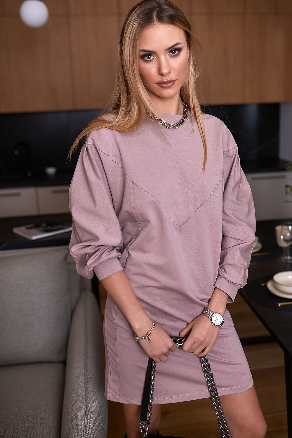 Are you looking for a casual dress that you feel comfortable in? A cappuccino-colored cotton dress will work for many everyday outfits. The dress features a half-round neckline, long sleeves and pockets.