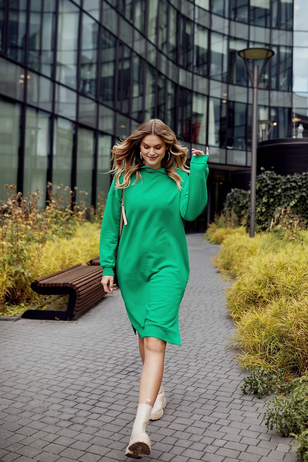 Cotton dress in sporty style will be perfect for autumn and winter styling. If you care about comfort, the loose cut will work well for everyday wear. Ideal for women who like oversized dresses. Dress with long sleeves, hood and slip pockets. Slits on the sides.