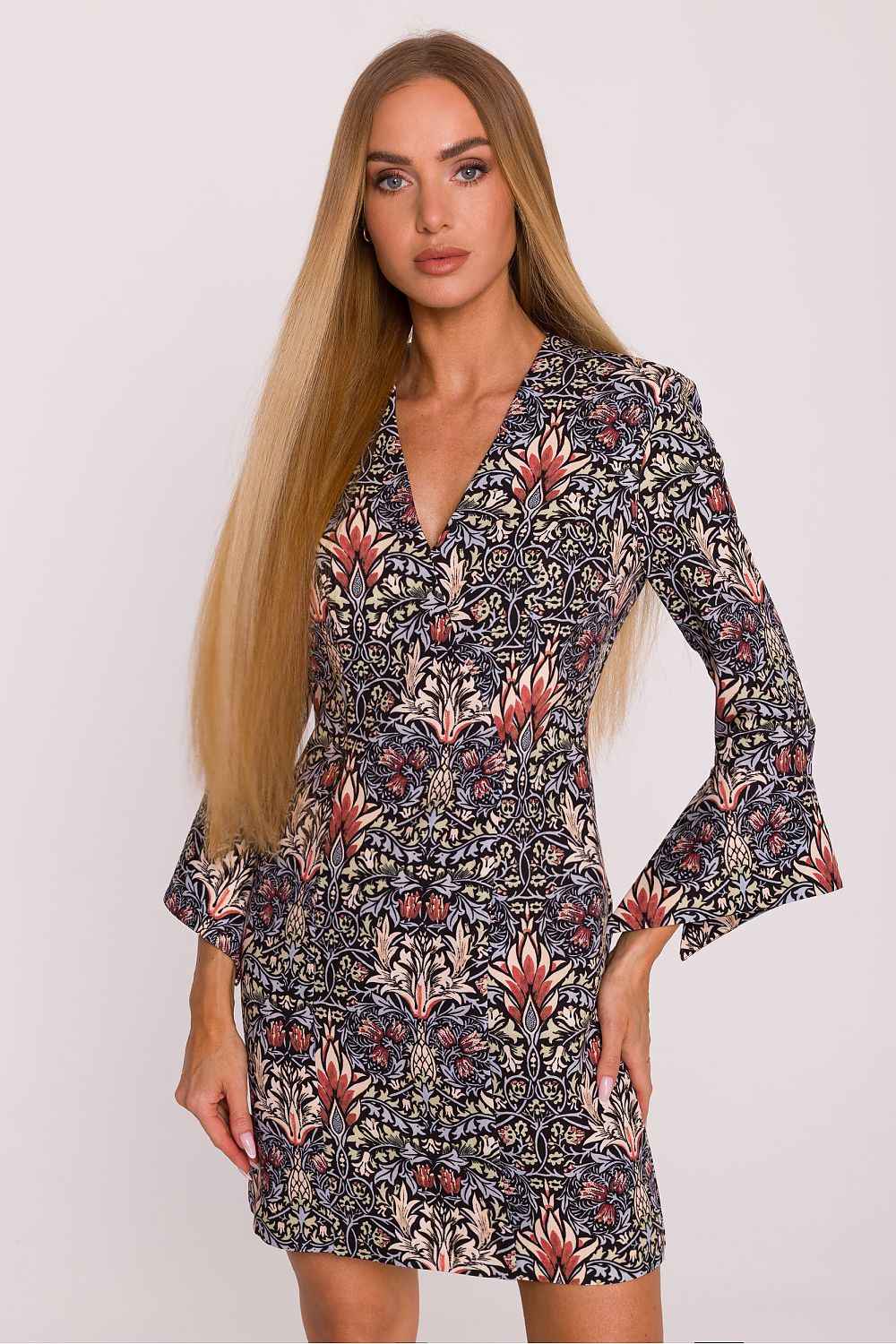 The unique dress made of fabric with a colorful plant print is a proposal that combines feminine charm with a touch of retro style. The matte finish of the material adds elegance and subtlety, while the decorative floral pattern attracts attention and livens up the outfit. The model features a V-neckline that beautifully slims the neck and adds lightness. The 7/8 length sleeves end with a delicate flare, giving the dress a flowing and slightly romantic character. The dress is fastened at the back with a hidden zipper, ensuring comfort and aesthetic finish. The simple, slightly tailored cut is designed to gently emphasize the silhouette, remaining loose towards the bottom. The mini length gives the dress a youthful character and makes it perfect for both everyday wear and more special occasions. Designed and made in Poland for women who appreciate style, comfort, and original details.