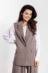 Stylish vest in a simple, classic cut is a timeless wardrobe staple. The single-button closure and lapels at the neckline emphasize its elegant character, while the slightly elongated line slims the silhouette. Practical flap pockets add a modern touch, and the versatile design allows you to pair the vest with trousers, cigarette pants, or a skirt. Perfect for both business and casual styling.