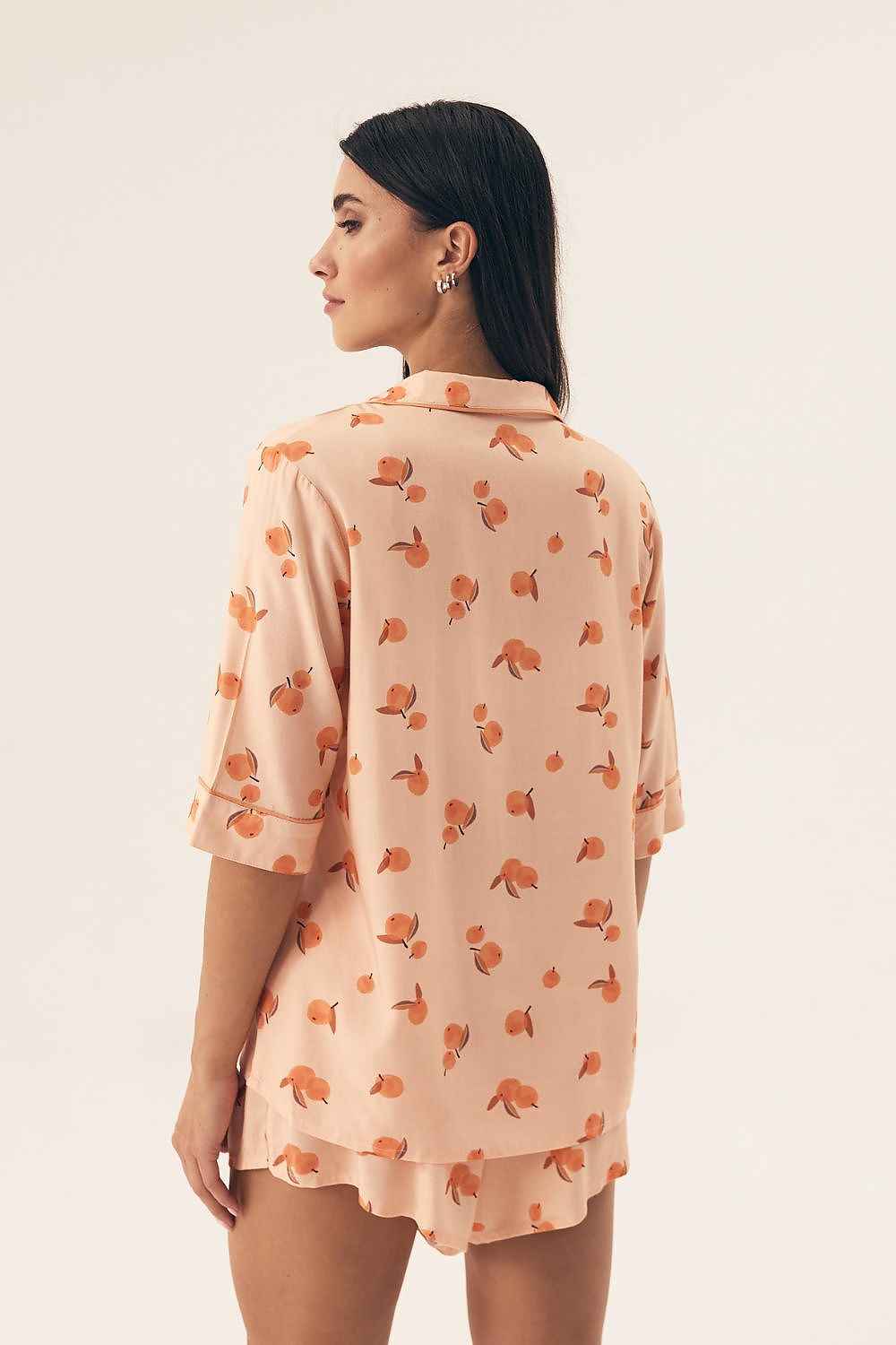 Elegant women's pajamas with subtle piping details that combine style with comfort. The short-sleeved blouse, buttoned, finished with a collar, creates a classic yet comfortable look. The loose fit provides freedom of movement, and the printed fabric adds charm. Shorts without pockets with a wide elastic waistband guarantee comfort all night long. Made of breathable knit fabric, perfect for warm nights. Pajamas packed in a practical plastic bag, ideal as a gift.