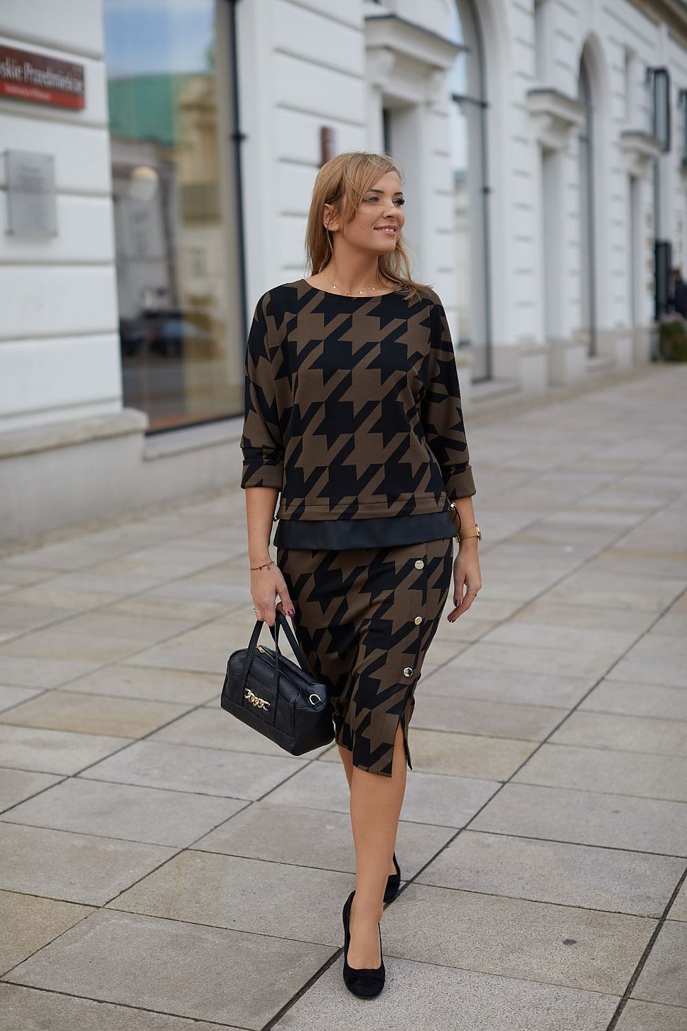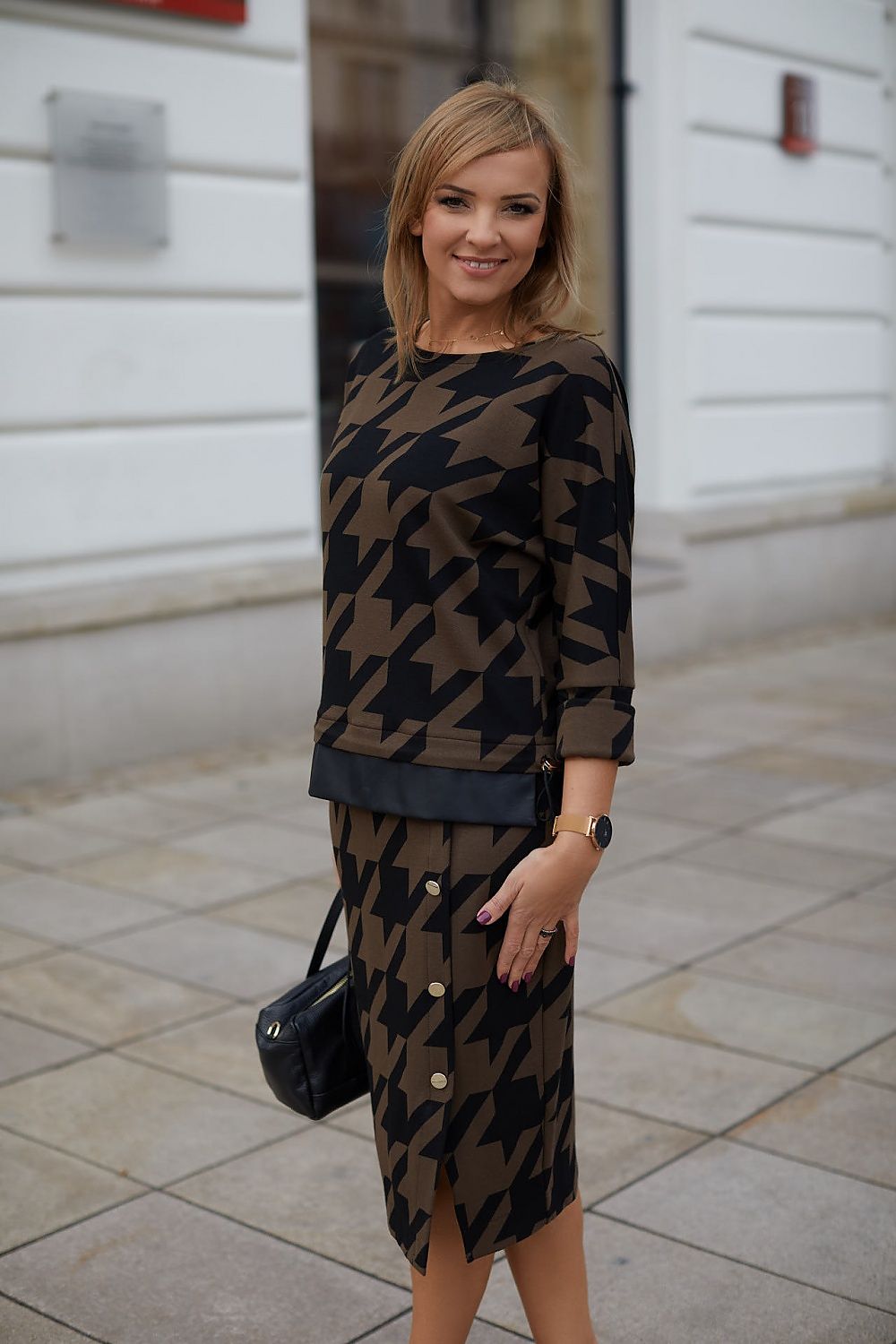 This two-piece women's set has stolen the hearts of our customers. It was entirely sewn from soft jacquard knit fabric. The upper part is in the form of a kimono, with a wider roll-up sleeve. The slightly fitted skirt with gold buttons adds a fashionable touch. A wide elastic sewn into the waistband makes the skirt allow for a perfect fit to the figure of the owner. The blouse is decorated with a leather piping. Decorative metal stoppers at the bottom of the blouse also add to the attractiveness. This thoughtful cut gives comfort to women of all sizes. Entirely unlined.