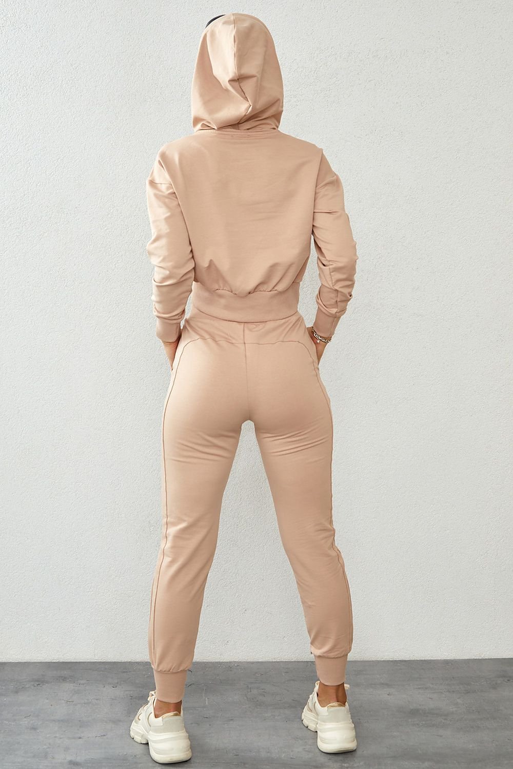 A youthful set with a short sweatshirt perfect for casual wear. Asymmetrical short sweatshirt, with a hood and long sleeves. Long pants with an elevated waist and tapered legs. Waistband with elastic and binding, slip pockets on the sides.