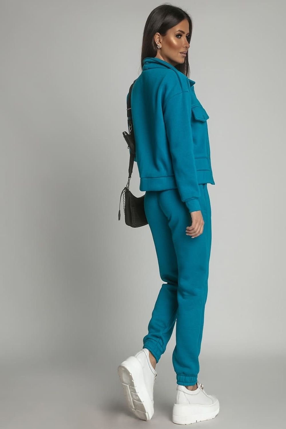 Turquoise insulated women's set is a sporty choice for women of all ages. It will be great for colder days. The set can be freely combined with other items of clothing to create a unique look. Long-sleeved bomber jacket, fastened with press studs, pockets on the front. Sweatpants with binding at the waist, slip pockets, legs finished with welts. It's worth dipping into luxury and enjoying the unique style!