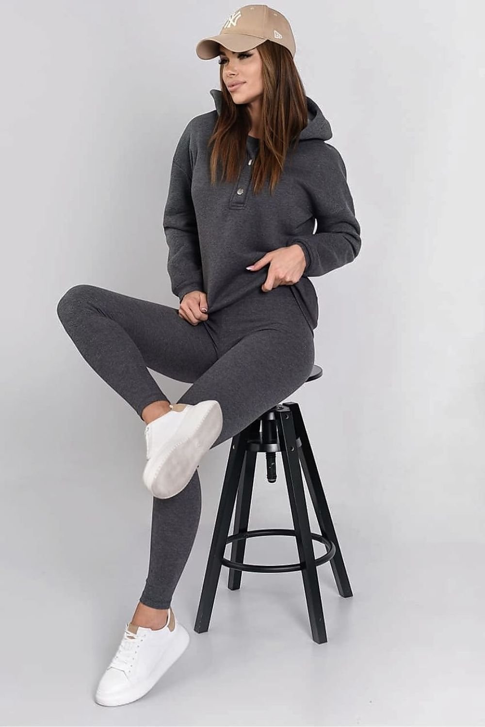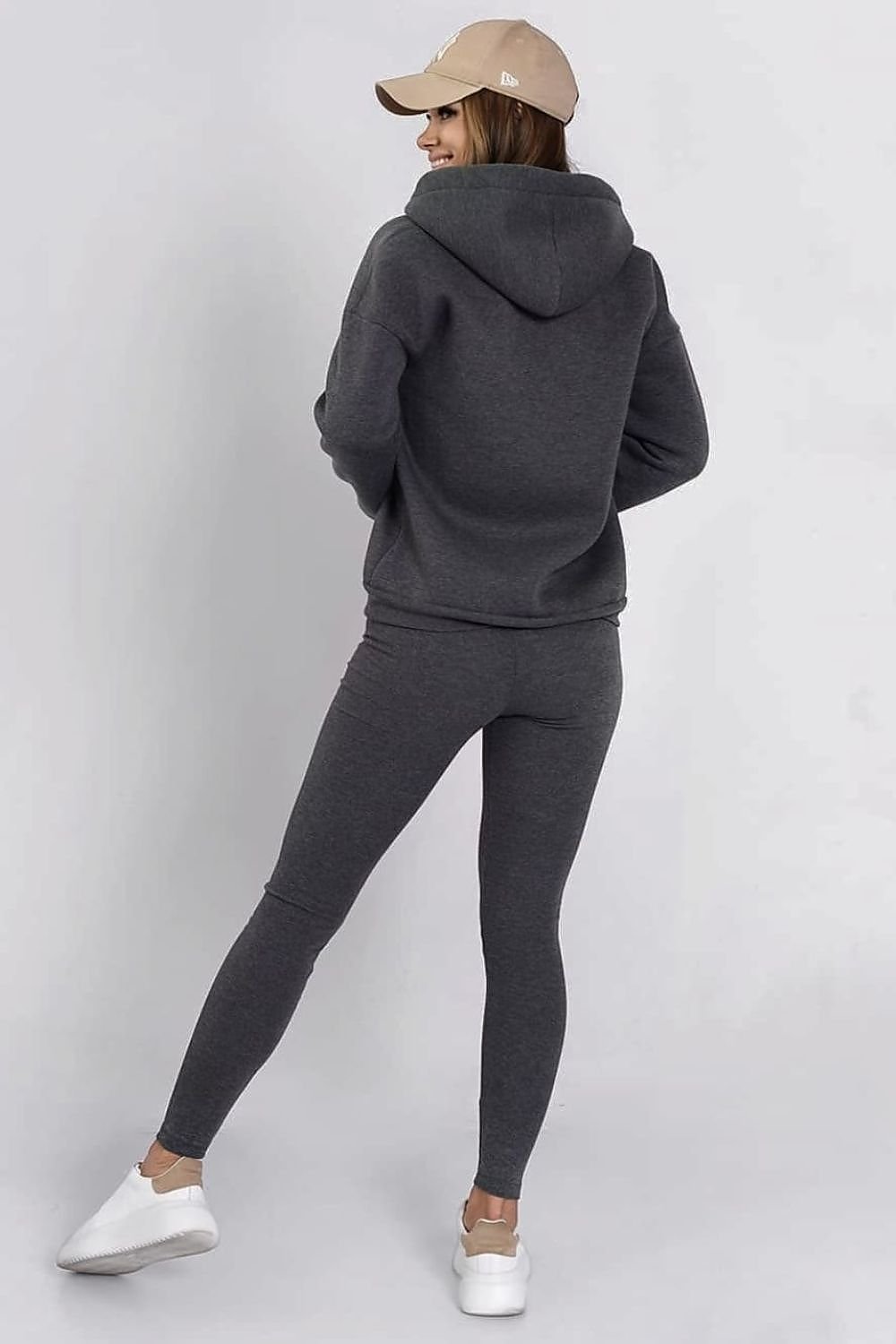 Women's set consisting of three pieces, an elastic striped top, striped fabric leggings and an insulated hoodie. The hoodie has a hood and long sleeves. The short is on wide shoulder straps. Leggings with tapered legs, with an elastic waistband. Opt for a comfortable set that will stay with you all year round. Delight with complete freedom!