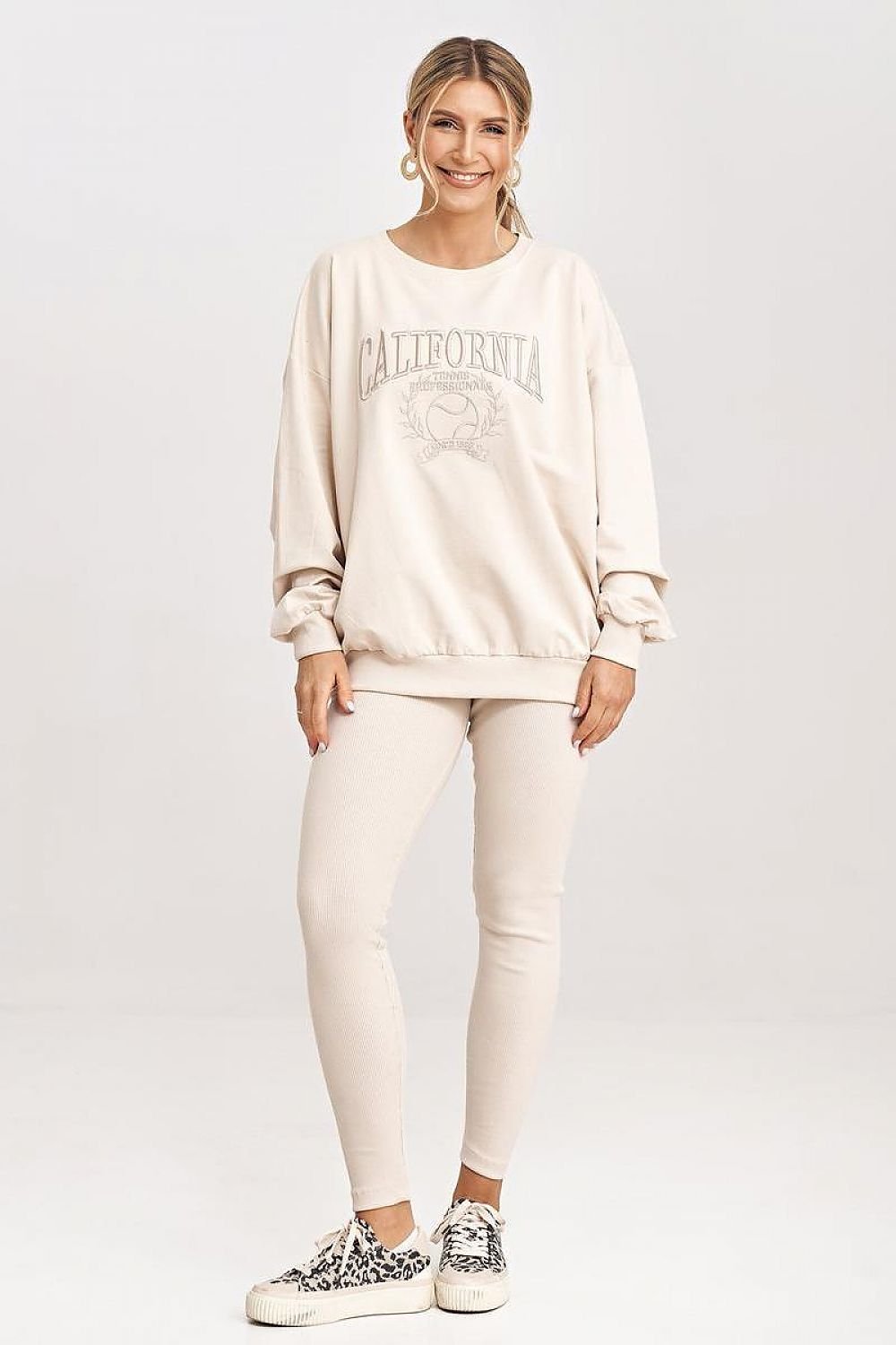 A tracksuit set consisting of a sweatshirt and leggings. Extended sweatshirt with long sleeves and a round neckline. Long leggings with an elastic waistband. One size fits all for individuals wearing size S or M.