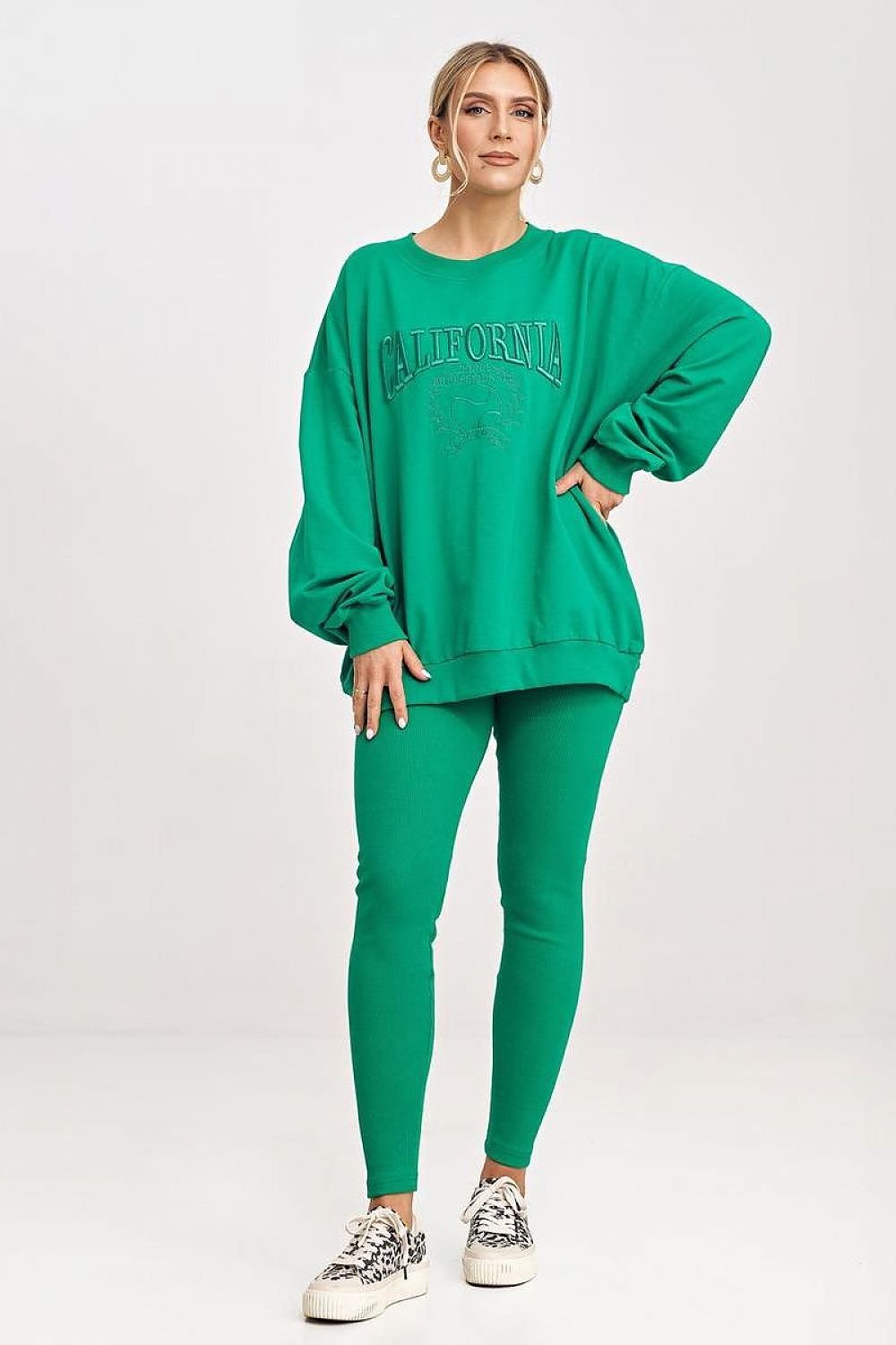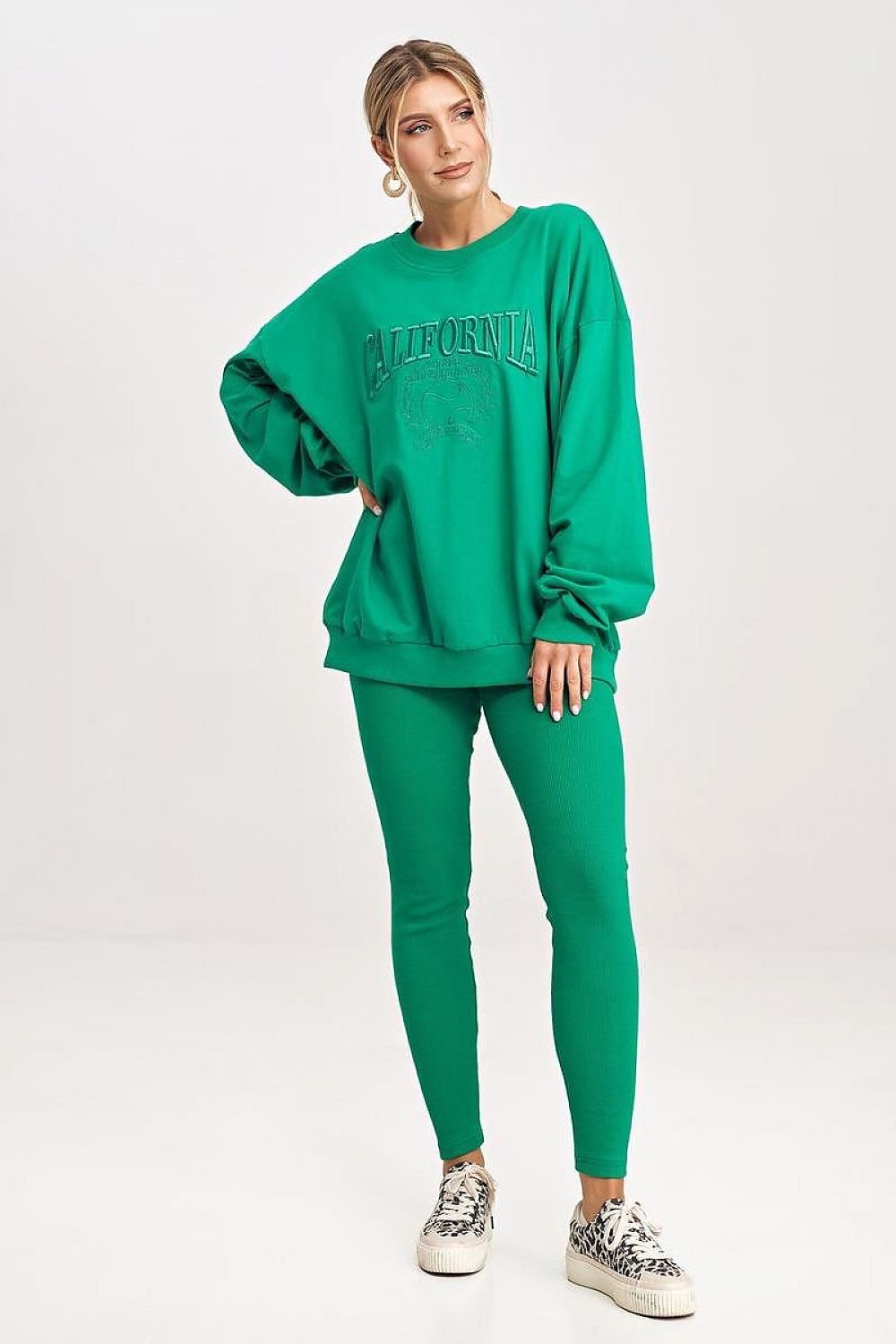 A tracksuit set consisting of a sweatshirt and leggings. Extended sweatshirt with long sleeves and a round neckline. Long leggings with an elastic waistband. One size fits all for individuals wearing size S or M.