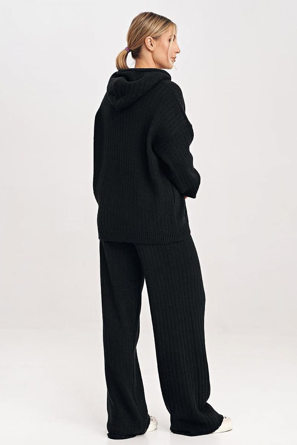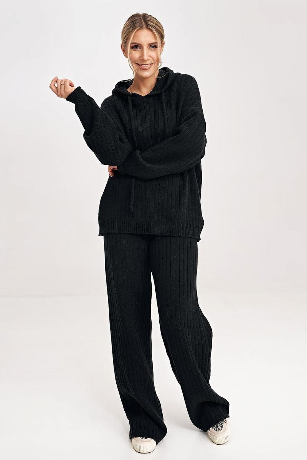 A knit set consisting of a sweatshirt and pants. The sweatshirt has long sleeves and a hood. The long pants have wide legs and an elastic waistband.