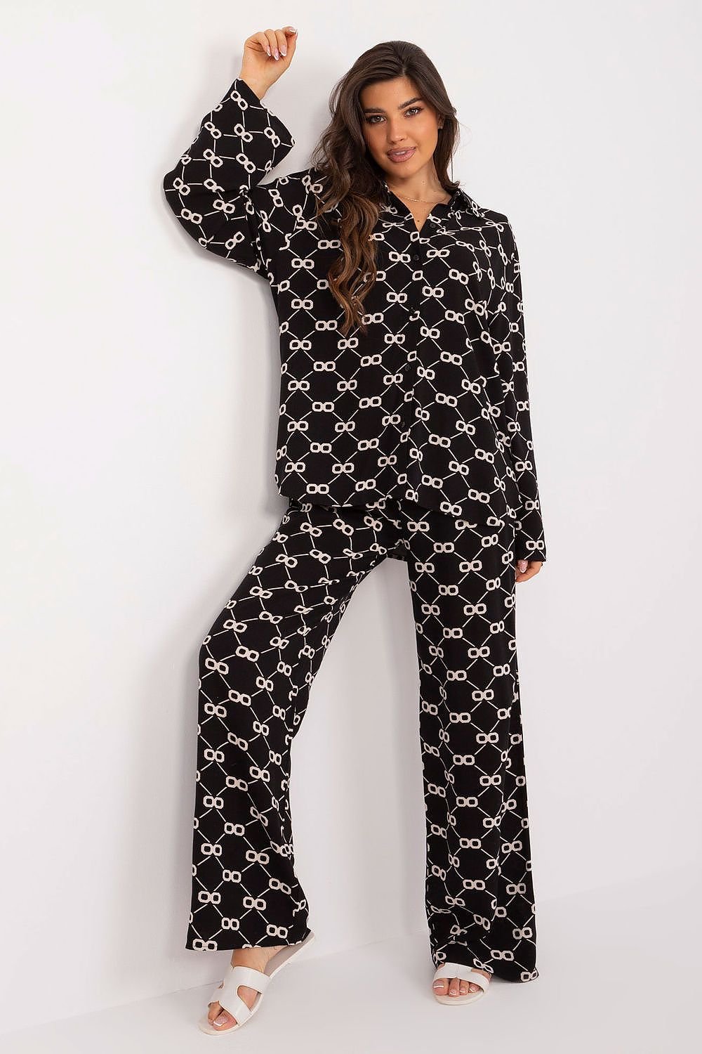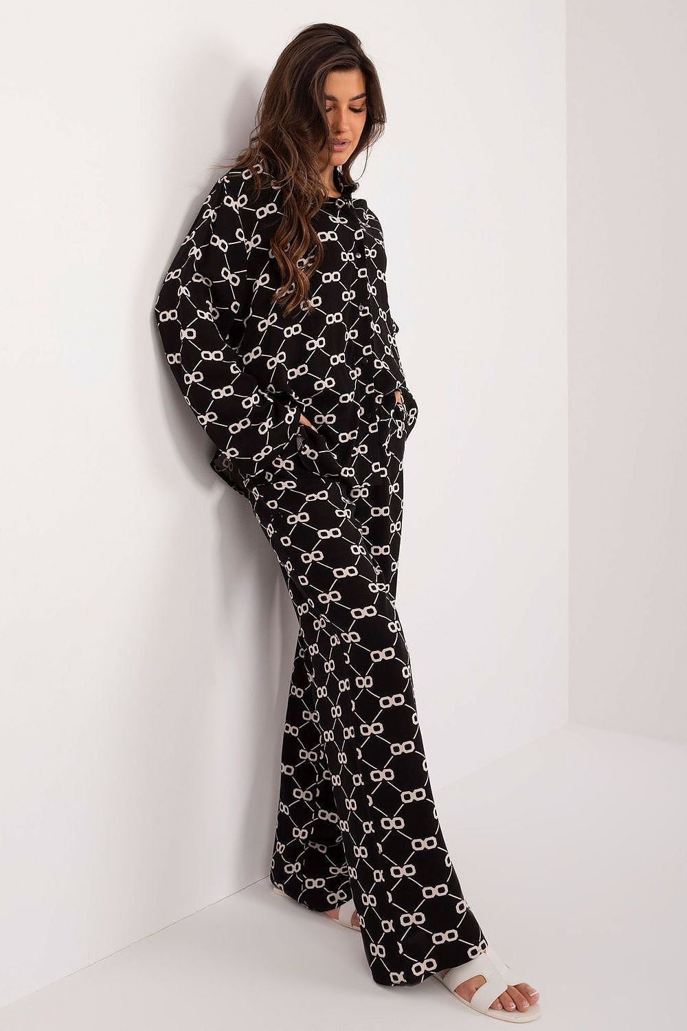 Discover a summer women's set consisting of an elegant shirt and comfortable pants. This ensemble is the perfect choice for everyday outings, offering a combination of comfort and style. The stylish shirt buttons up, making it easy to put on and take off. It also features an additional waist tie that accentuates the silhouette and adds charm. The shirt has long sleeves, making it suitable for cooler days. The classic collar adds a formal touch to the shirt, balancing its casual style perfectly. The pants are equipped with a waist tie, allowing for a perfect fit to the silhouette. The straight legs make the pants versatile and suitable for various outfits. The high waist ensures comfort and highlights the waist. Practical, slip-in side pockets add functionality and convenience. The set is adorned with an original print that catches the eye and adds freshness to every outfit.