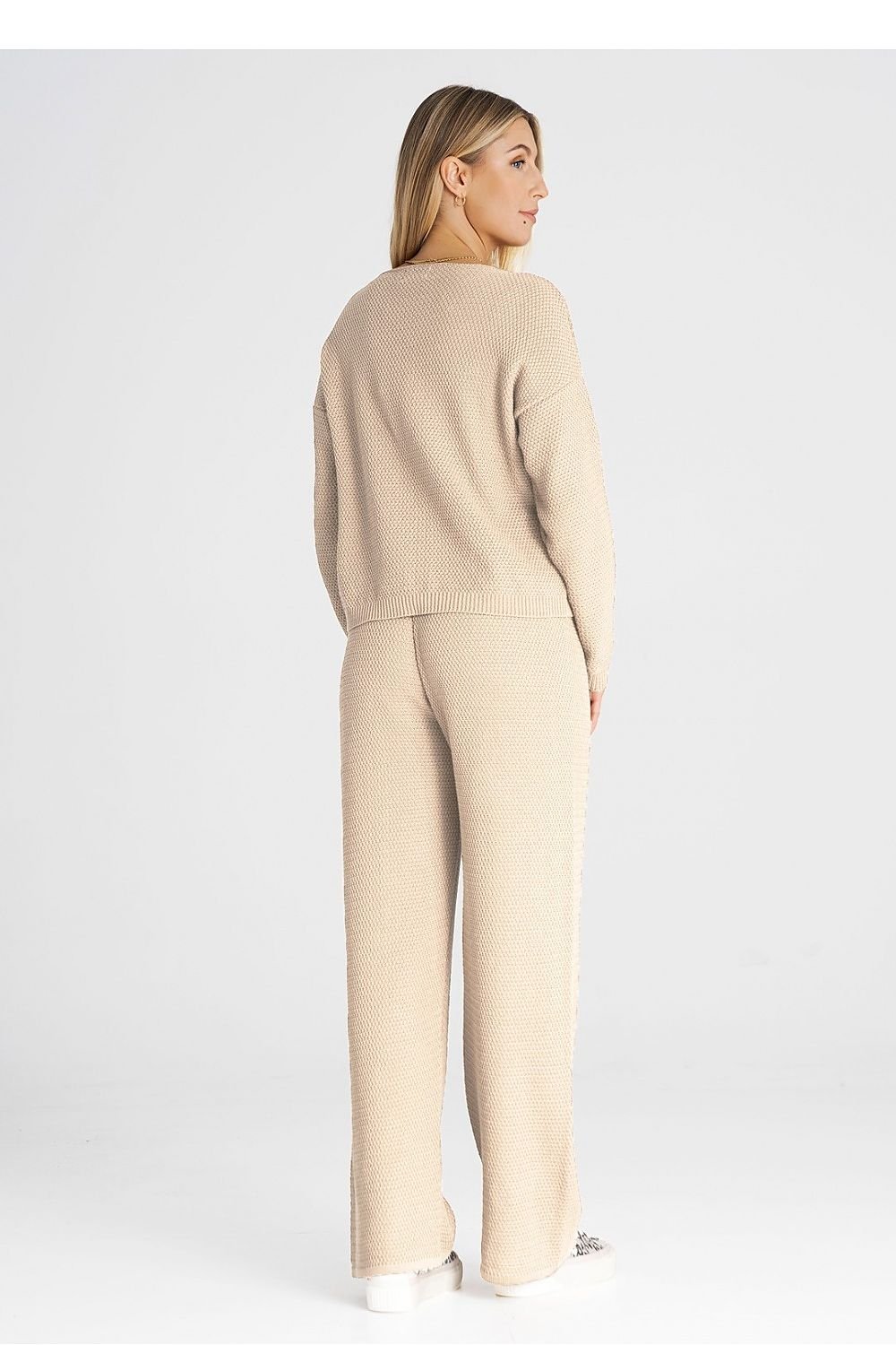 A set consisting of a sweatshirt and pants. Long loose pants with a tie at the waist. Blouse with long sleeves and a wide neckline.