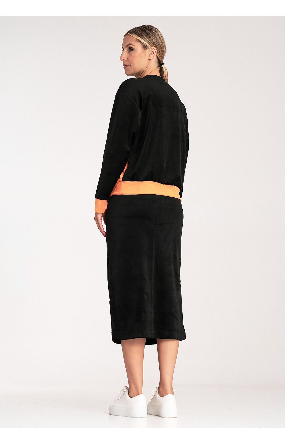 Ladies' velour set, consisting of a two-color blouse and skirt. Blouse with long sleeves and a round neckline. Pencil skirt with a slit on the right side, wide elastic sewn into the waist, unlined.