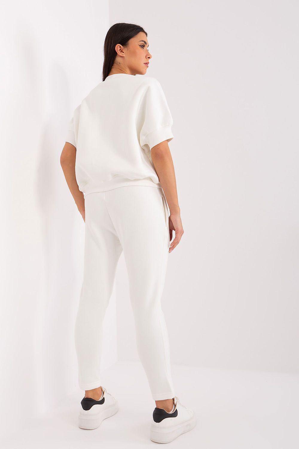 Insulated women's casual sweatshirt set, ideal for colder days, consists of a sweatshirt and pants. Made from a combination of cotton and polyester, the set provides warmth, comfort and durability, ideal for everyday styling. The standard-length sweatshirt has short sleeves and a round neckline, giving it a lightweight and casual feel, despite the warmth. On the front of the sweatshirt there is a fashionable print, which adds originality and youthfulness to the set. The smooth design maintains a minimalist, universal look, easy to combine with other garments. The pants have tapered legs and a high waist, which accentuates the silhouette and ensures wearing comfort. There is an elastic waistband that guarantees a perfect fit. In addition, the pants are equipped with side slip pockets, making them a practical choice for everyday wear. This set is the perfect combination of comfort and style for cold, everyday days.