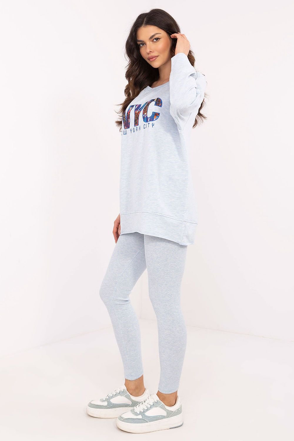 Women's set consisting of a sweatshirt and leggings is the perfect combination of comfort and style. The sweatshirt has a print on the front, which gives it a unique character and emphasizes the modern design. Made from a blend of high-quality cotton, polyester and elastane, it provides comfort and durability. Leggings are distinguished by a high waist, which perfectly emphasizes the waist and provides comfort during daily activities. The tapered legs fit the figure perfectly, and the ribbed material adds subtle texture and a fashionable look. The set will be perfect for everyday outings, walks or moments of relaxation at home. The combination of universal style and functionality makes it a great choice for any season.