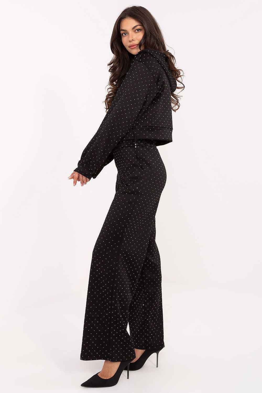 Stylish and comfortable women's tracksuit set is the perfect combination of elegance and everyday comfort. The set consists of a zip-up hoodie with a hood and drawstrings, and pants with an elastic waistband, creating a fashionable yet practical whole. The model is made of a high-quality blend of viscose and polyester with a varied texture of material, which drapes beautifully and ensures comfortable wear. The entire surface is adorned with a spectacular jet application, giving the set an elegant character and subtle glow. High-waisted pants with wide, long legs and side slip pockets guarantee comfort and freedom of movement. The long-sleeved hoodie perfectly complements the whole, making the set ideal for everyday styling, from casual outings to meetings in an elegant, urban style. This set is a combination of tracksuit comfort and refined appearance that will allow you to look stylish and feel comfortable in any situation.