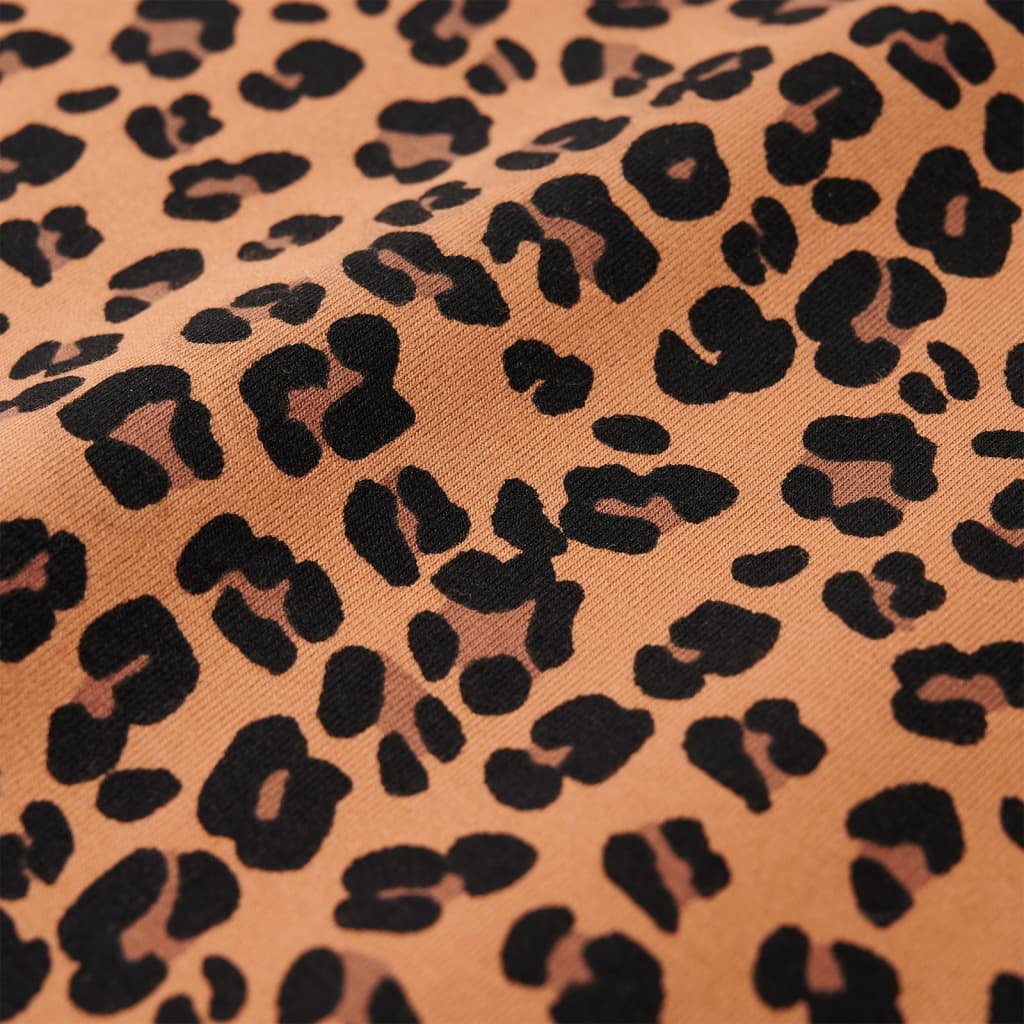 Esta sweatshirt para criança possui mangas compridas, uma estampa de leopardo, uma gola ondulada e um modelo loose fit (folgado). Esta roupa infantil cor conhaque-claro apresenta uma bainha ondulada com uma borda ligeiramente enrolada. A parte de cima para criança é feita de um material macio com 95% algodão e 5% elastano, proporcionando conforto e aconchego adicionais.