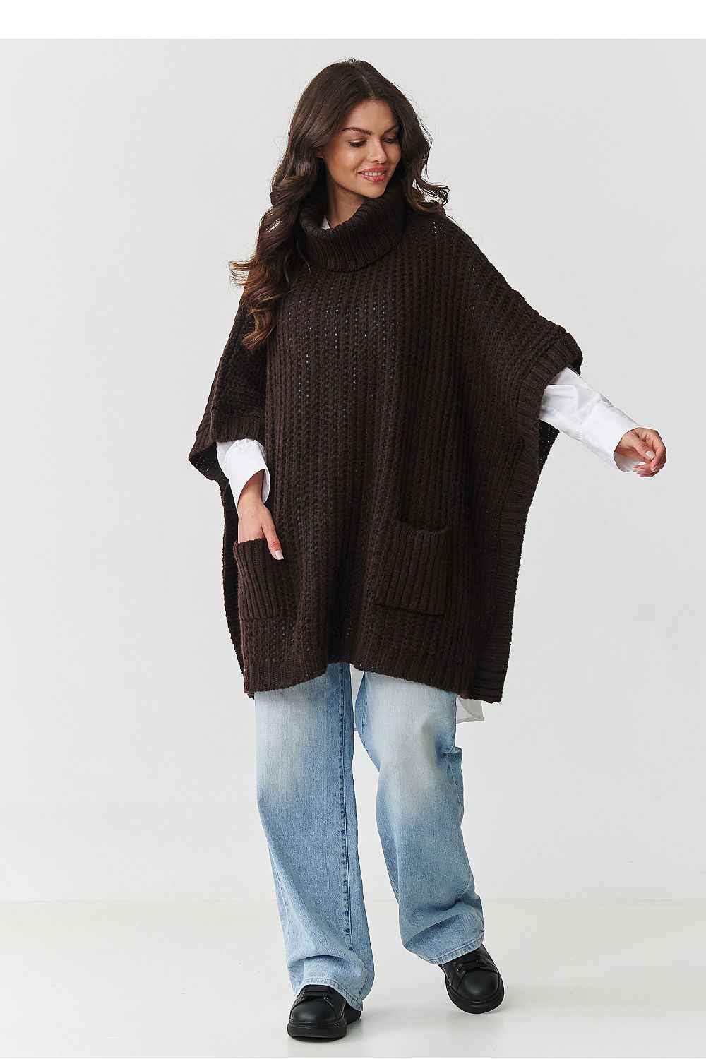Discover a unique women's poncho-style sweater that combines trendy design and unparalleled comfort. The loose, oversized silhouette with elbow-length sleeves and a high, non-fitting collar envelops the figure, adding style and providing warmth even on cooler days. Practical, large front pockets give it a casual character and make it perfect for everyday wear as well as more elegant stylings. Additionally, the sleeves and hem are finished with a narrow ribbing. The sweater is made from a high-quality blend of fibers: acrylic, polyester, wool, and polyamide, making it soft, pleasant to the touch, while also durable and resistant to deformation. The structural, thicker knit emphasizes its unique character, making it an ideal choice for autumn and winter. Available in timeless, fashionable colors: beige mélange - a classic that goes with everything, bottle green - deep and elegant, chocolate - a warm and sensual shade, graphite mélange - modern and versatile. If you are looking for a practical and stylish sweater, this model is a perfect choice. It pairs perfectly with jeans, leggings, or a classic shirt, creating stylish layered looks. Choose warmth, comfort, and timeless elegance, choose a poncho sweater with a collar and pockets that will quickly become a favorite piece in your fall-winter wardrobe.