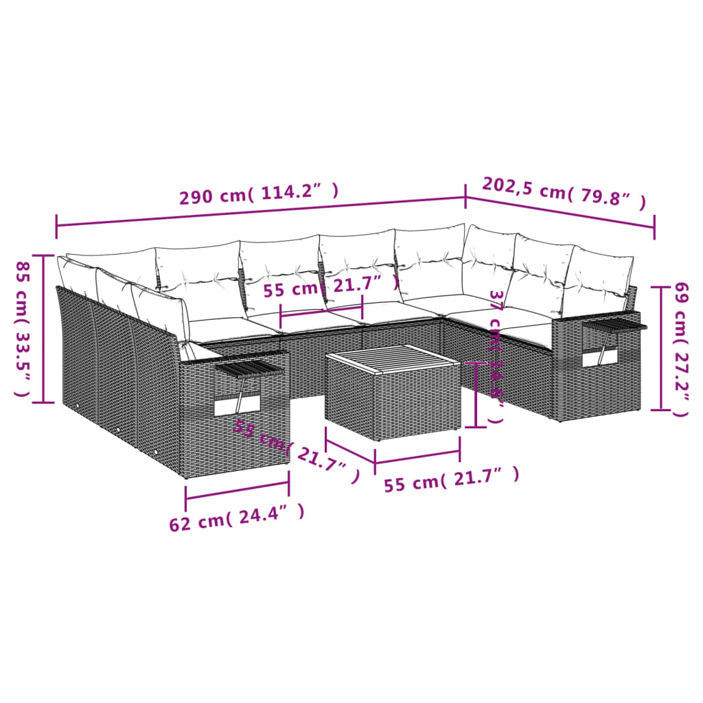 vidaXL 10 pcs conjunto sofás p/ jardim c/ almofadões vime PE cinzento