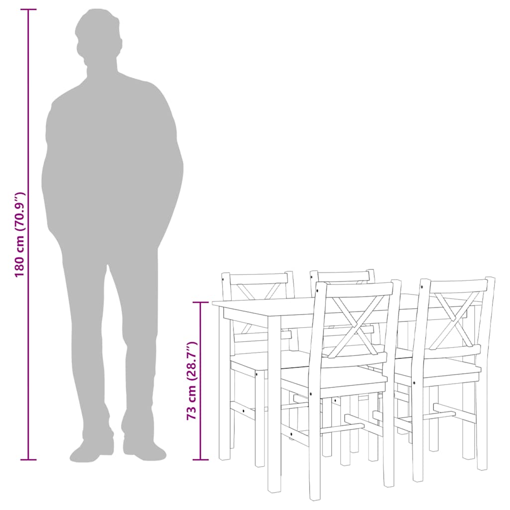 Este conjunto de mesa de jantar é feito de madeira maciça com um acabamento manchado atraente para uma aparência elegante, que definitivamente lhe vai proporcionar anos de utilização. A entrega inclui quatro cadeiras e uma mesa.