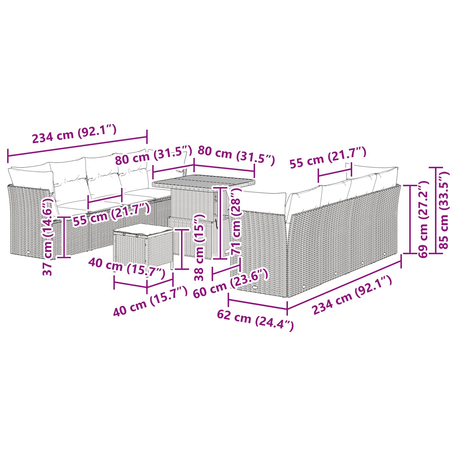 • 4 x Assento de Canto: 62 x 62 x 69 cm (LxPxA)