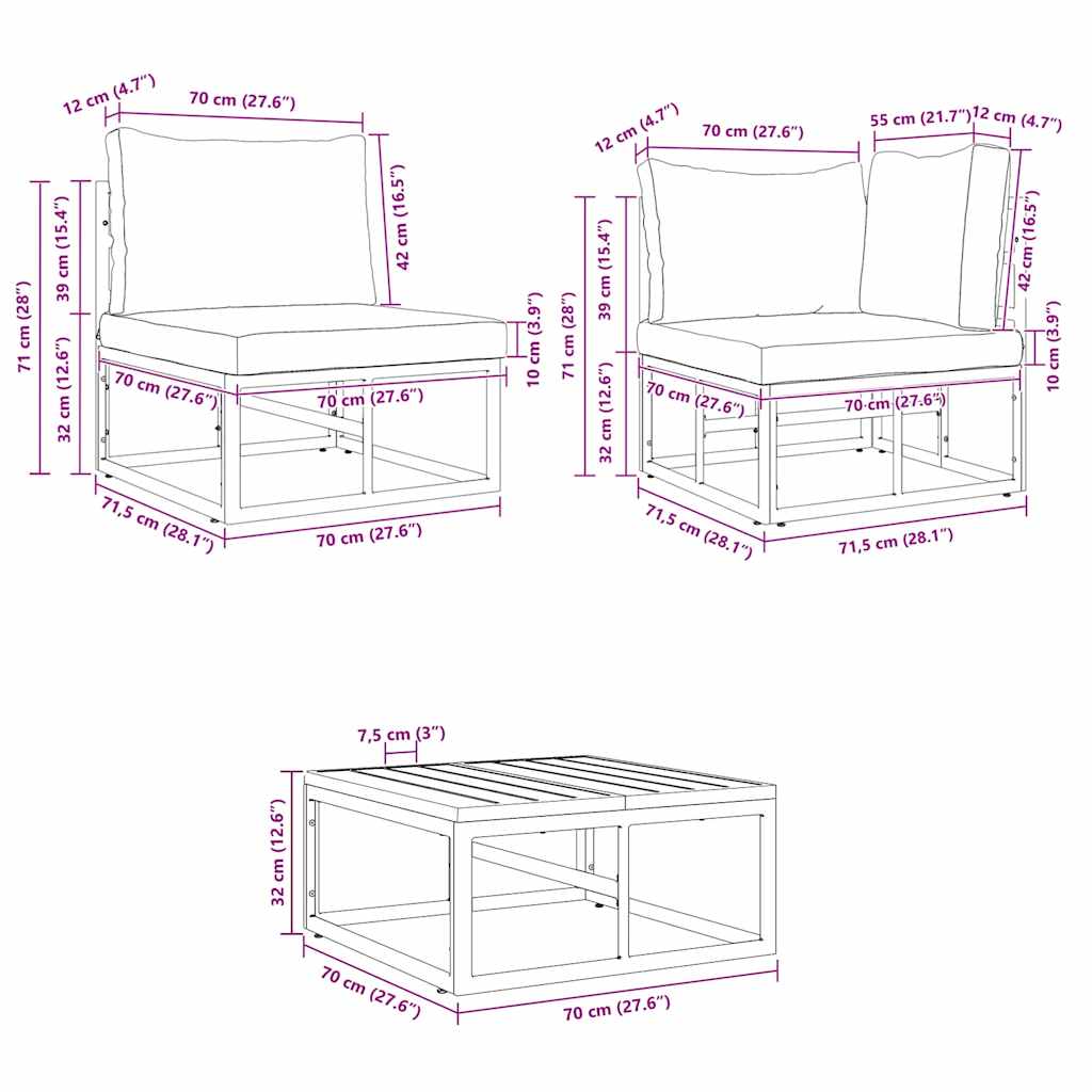 • 1 x Assento central: 70 x 71.5 x 71 cm (LxPxA)