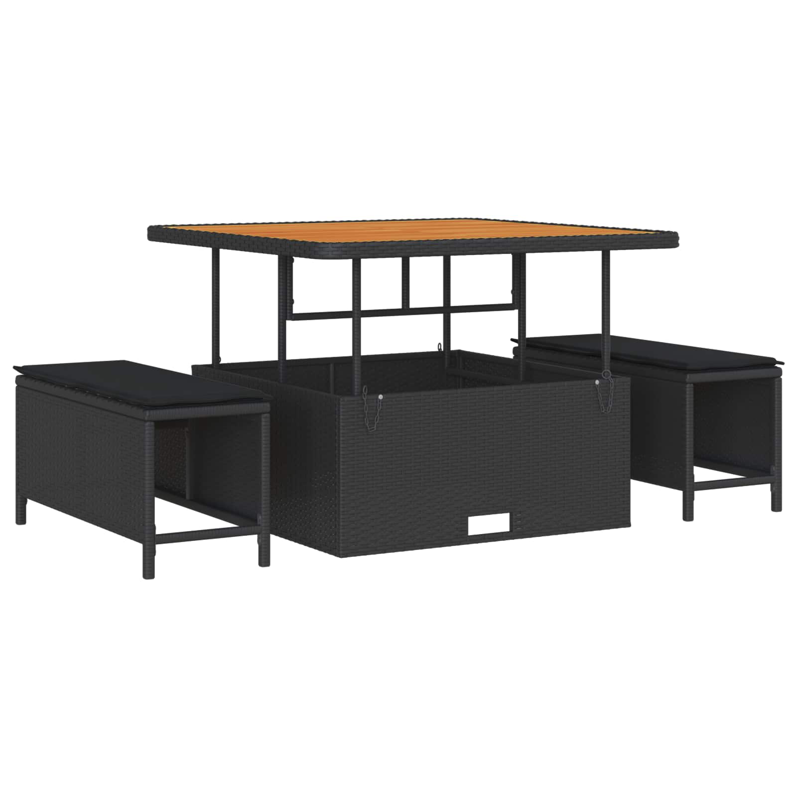 • Superfície de Madeira de Acácia A superfície de madeira de acácia traz um toque natural e aconchegante pro conjunto. Ela contrasta legal com o poli rattan, deixando tudo mais bonito enquanto mantém a funcionalidade. Resistente à umidade e pragas, a acácia garante durabilidade e um charme eterno.
