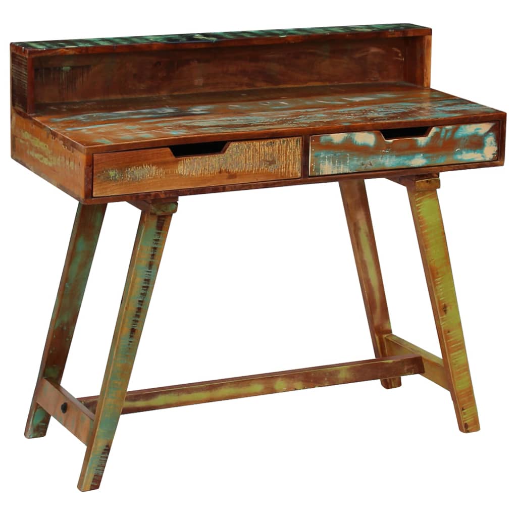 Esta mesa de estilo vintage, feita de madeira reciclada sólida, será um complemento intemporal para a sua casa. A mesa fornece uma superfície estável e segura na qual pode colocar as suas bebidas, uma cesta de frutas, vasos ou outros itens decorativos. Possui duas gavetas que fornecem um amplo espaço para armazenar itens pequenos tais como chaves, blocos de notas e outros bibelôs. A mesa pode ser usada como uma mesa de computador, mesa de trabalho, mesa de escritório, mesa de leitura, mesa de estudo, etc.